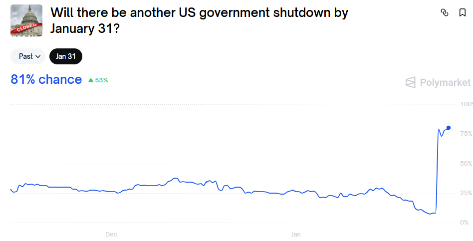 Dalším důležitým faktorem je politická situace v USA. Riziko opětovného shutdownu federální vlády se podle predikčních trhů pohybuje téměř na úrovni 80 %, což trhy vnímají jako významný zdroj nejistoty. Historicky platí, že v obdobích politického napětí a fiskální nestability roste zájem investorů o zlato jako bezpečný přístav.