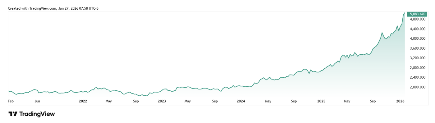 Na globálních finančních trzích jsme svědky bezprecedentního vývoje. Zlato, tradiční uchovatel hodnoty, v posledních dnech definitivně překonalo psychologickou i technickou hranici 5 000 USD za trojskou unci. Během obchodování dosáhla cena úrovně přibližně 5 100 USD, čímž potvrdila přetrvávající dynamiku růstu, která trvá už šest po sobě jdoucích dní. Klíčové je, že tento pohyb neznamená pouze krátkodobý výkyv ceny, ale důsledek dlouhodobého trendu, během kterého se hodnota kovu za poslední dva roky více než zdvojnásobila.*